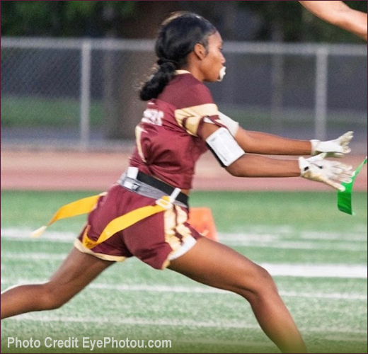 Jazz Landers played outstanding leading the team with 9 flag pulls and the aforementioned interception in the end zone. The two freshmen, Rhian Fitzgerald and Kristin Juniel both had 5 tackles a piece, two of them sacks by Juniel. Jazira Arteaga Khandilyan had three flag pulls, Naomi Brister had one. Paris Jones and Janiya Brister were solid on the back end with two flag pulls a piece.