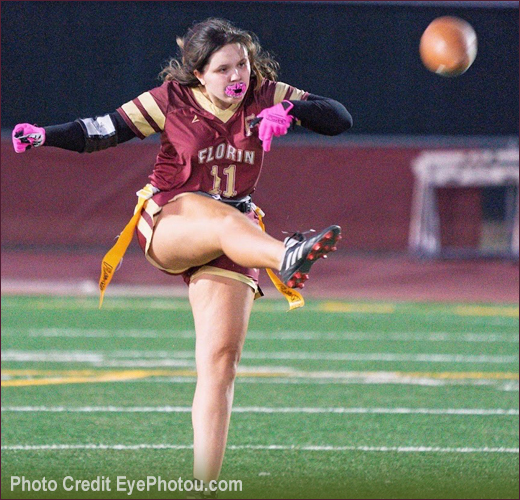 The first snap of the game, PG QB Kate Myers did her best Shakira impersonation and hip wiggled and flag guarded her way to the endzone on a 50 yard run. The Panthers acted like they never saw a flag before.