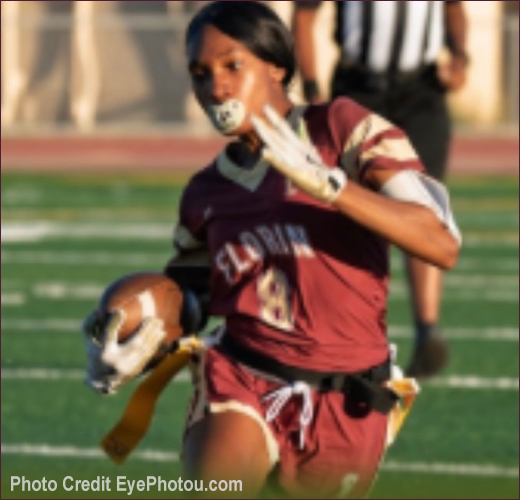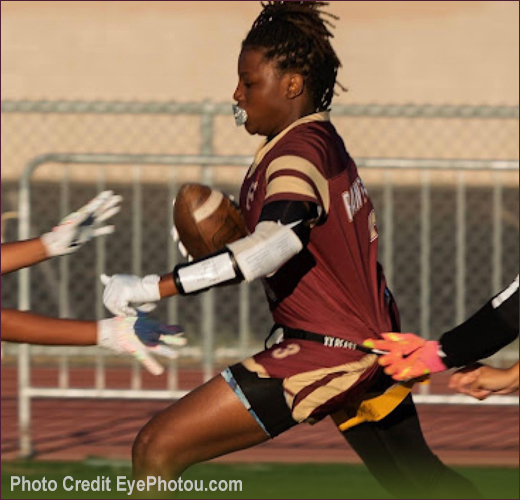 |  The Panthers learned from their mistake two days ago, in which they did not start fast, but after the momentum subsided this contest settled into a physical tug of war.  The Defense again was outstanding. Except for one play. A direct snap to #2 Cosumnes Oaks All League Running Back Abby Greene.  After swarming the Wolfpack offense all evening, Greene pulled off the Houdini act. Despite being strung out by the sideline, Greene managed to Jump Swivel her hips, cutting back past numerous Panther Flag Pullers to the endzone. The Florin defense was stunned.  After a Jazz Landers interception of QB Avery Nogosek on the point after,  Florin led 7-6.  The Panther defense continued to be suffocating. Jazz Landers played outstanding leading the team with 9 flag pulls and the aforementioned interception in the end zone. The two freshmen, Rhian Fitzgerald and Kristin Juniel both had 5 tackles a piece, two of them sacks by Juniel. Jazira Arteaga Khandilyan had three flag pulls, Naomi Brister had one. Paris Jones and Janiya Brister were solid on the back end with two flag pulls a piece.