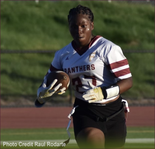 The game started well for Florin. The Panthers scored on its opening drive. After forcing Johnson to three and out, Florin QB1 Jayda Lewis rolled out on a boot pass and hit Janiya Brister on a Comeback. The Warrior defensive back had good position and fought for the football, but Brister wanted it more. The sophomore two way player snatched the ball at the high point then tightroped down the sideline for a Florin Panther 54 yard touchdown!